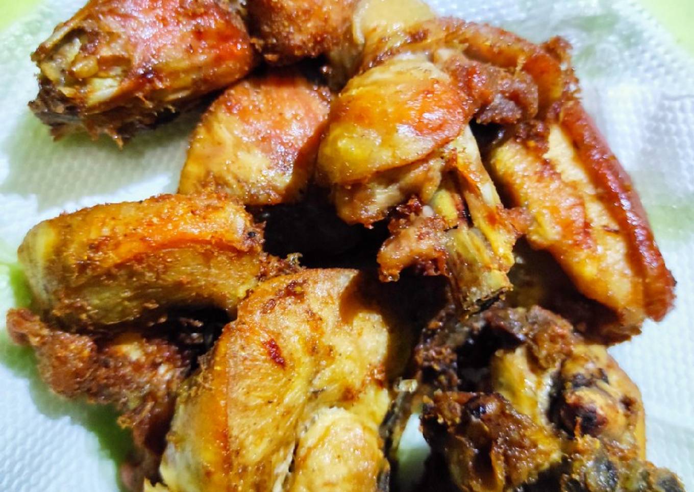 - Panaskan minyak goreng sampai benar-benar panas, kemudian masukan ayam ungkep. Goreng sampai golden brown. Balik dan masak sampai kedua sisinya matang.