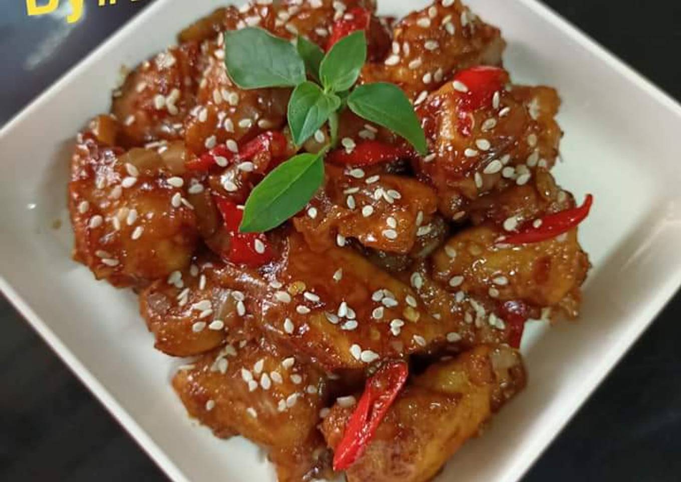- Setelah selesai goreng tuang minyak dan sisakan sedikit di wajan utk menumis,lalu tumis bawang putih &Bombay hingga berubah warna,lalu masukkan ayam goreng bersama cabe dan semua bahan D kecuali maizena dan Air, aduk hingga merata, terakhir masukan maizena yg sudah di larutkan dgn air, aduk cepat" dan matikan api