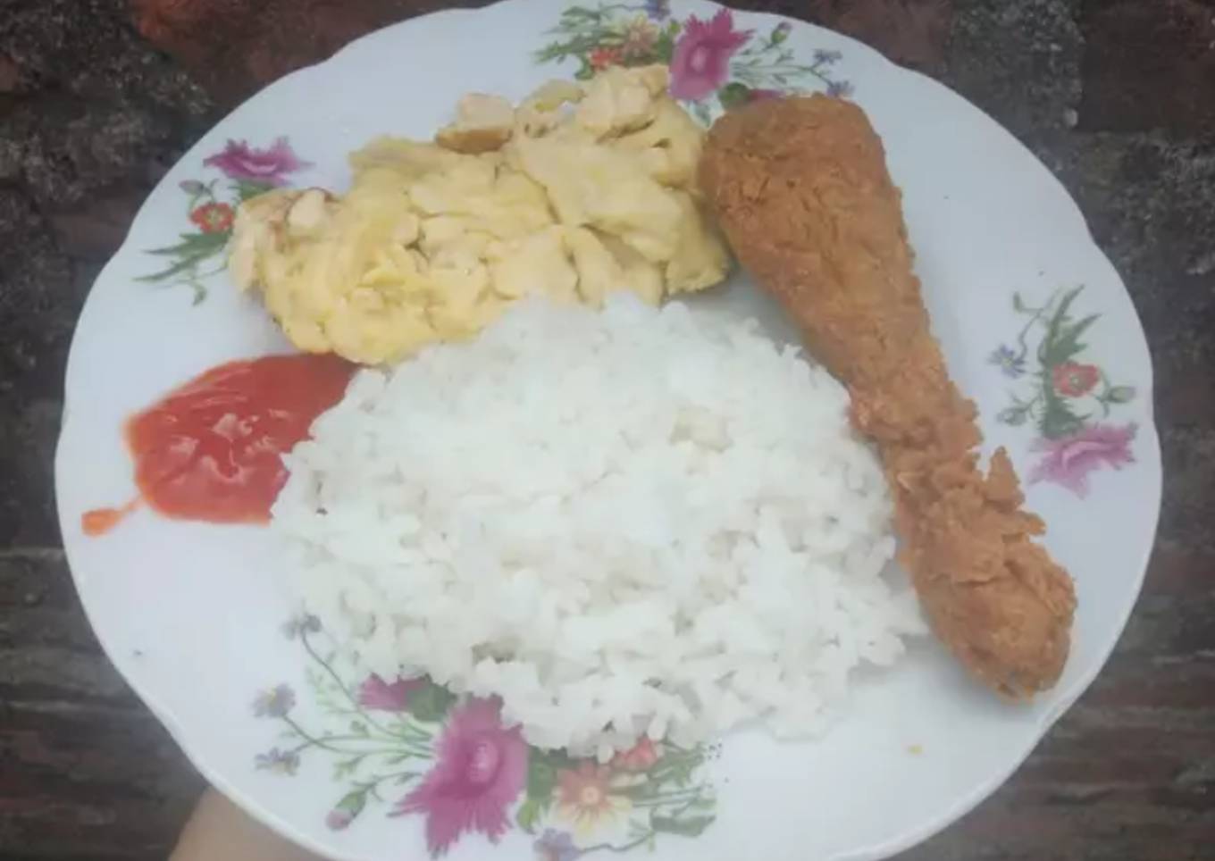 - Susun ayam, telur, nasi, serta beri saos. Selamat menikmati.