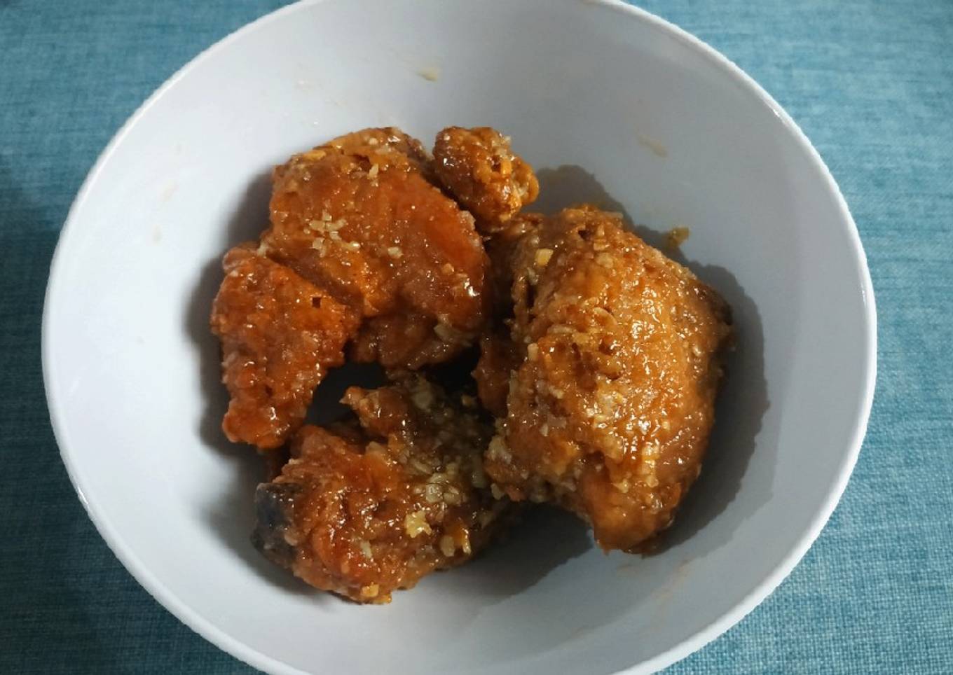 7. Fried chicken with garlic butter glazingnya sudah jadi. Karena dimasak hingga kering, kulitnya jadi renyah. Rasanya manis dan gurih 🥰