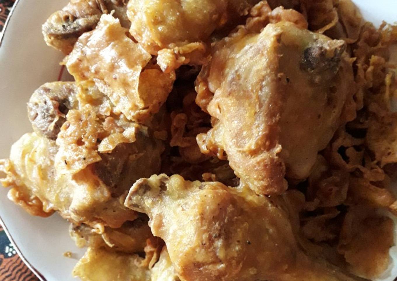 2. Masukkan ayam yg telah direbus ke dalam adonan basah. Lumuri hingga rata.